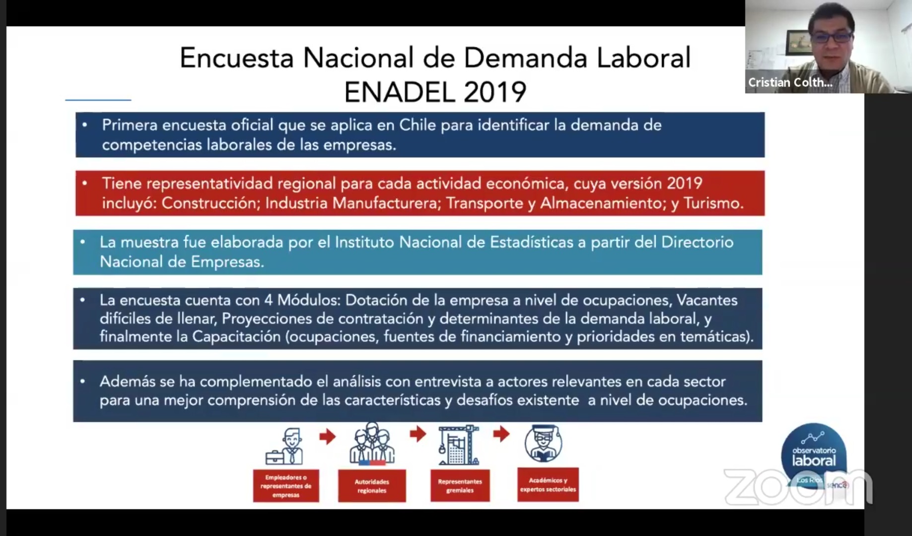 El lanzamiento de resultados se realizó a través del Facebook Live de Sence Los Ríos y de Radio El Conquistador. A cargo de la presentación estuvo Cristian Colther, analista senior del OLR. Uno de los efectos abordados fue la composición por grupo ocupacional en cada uno de los sectores.